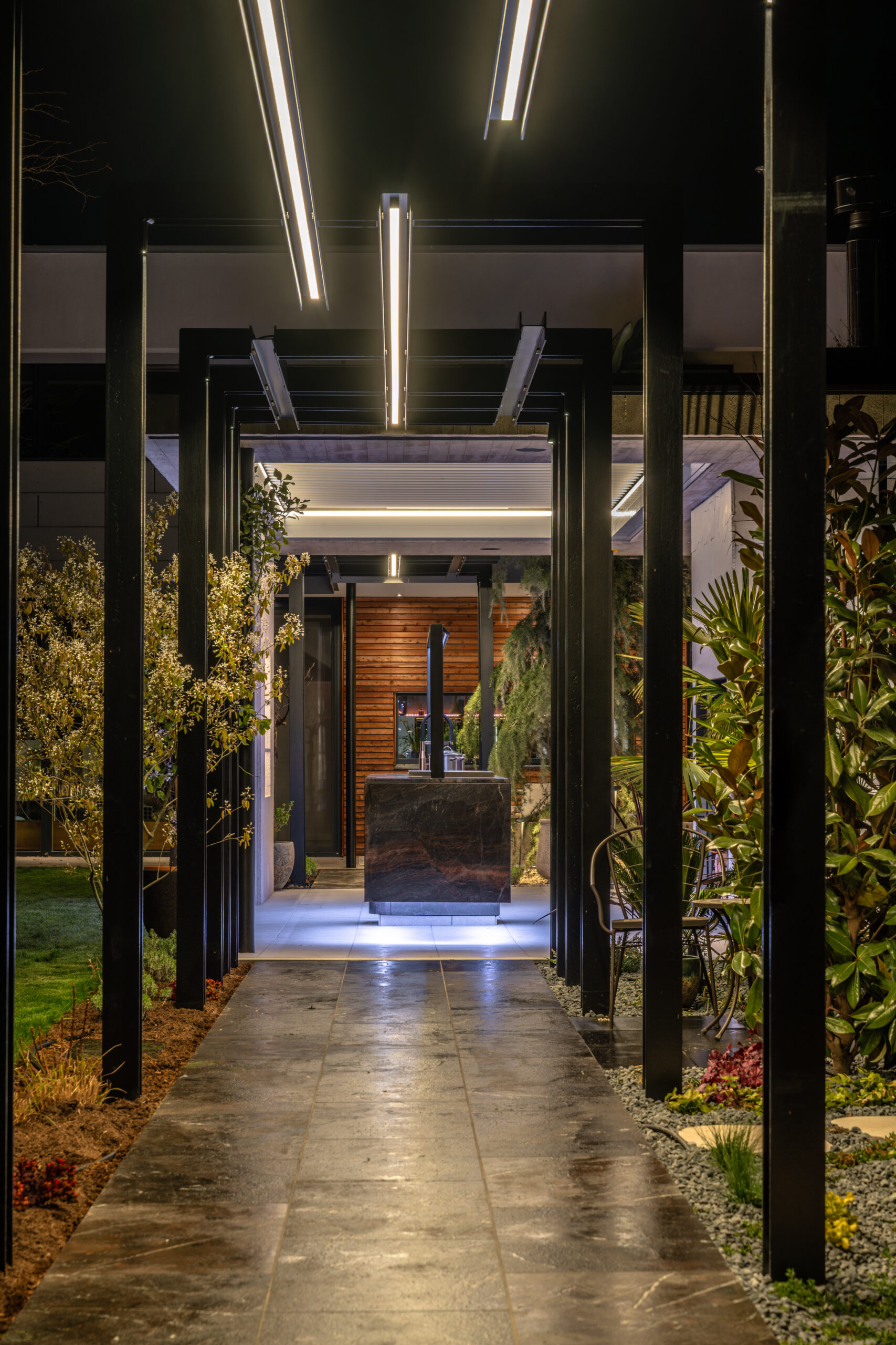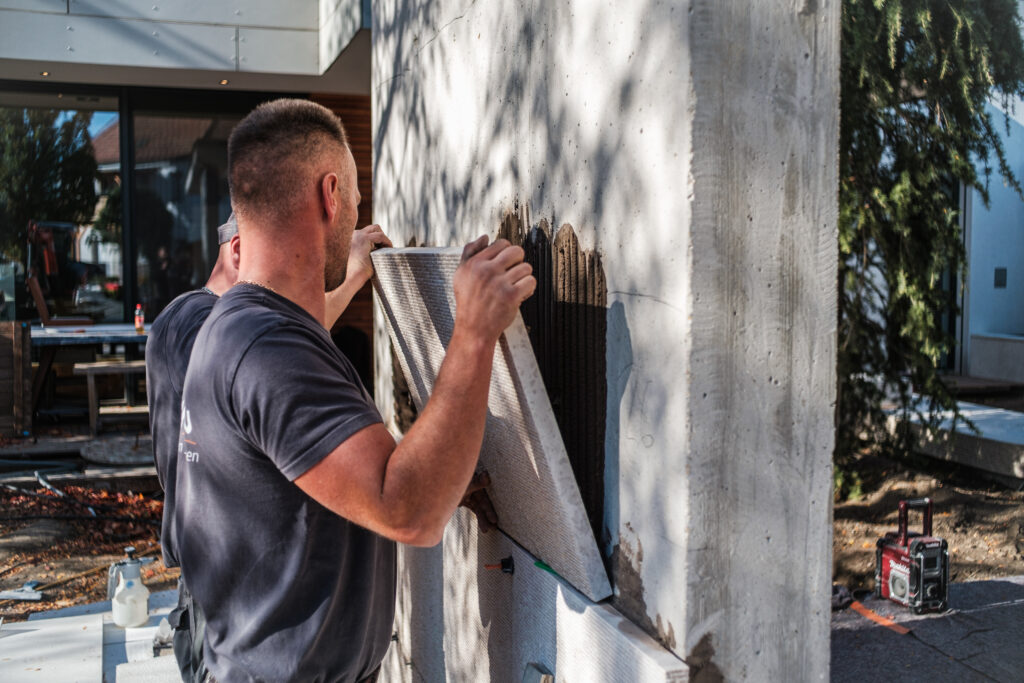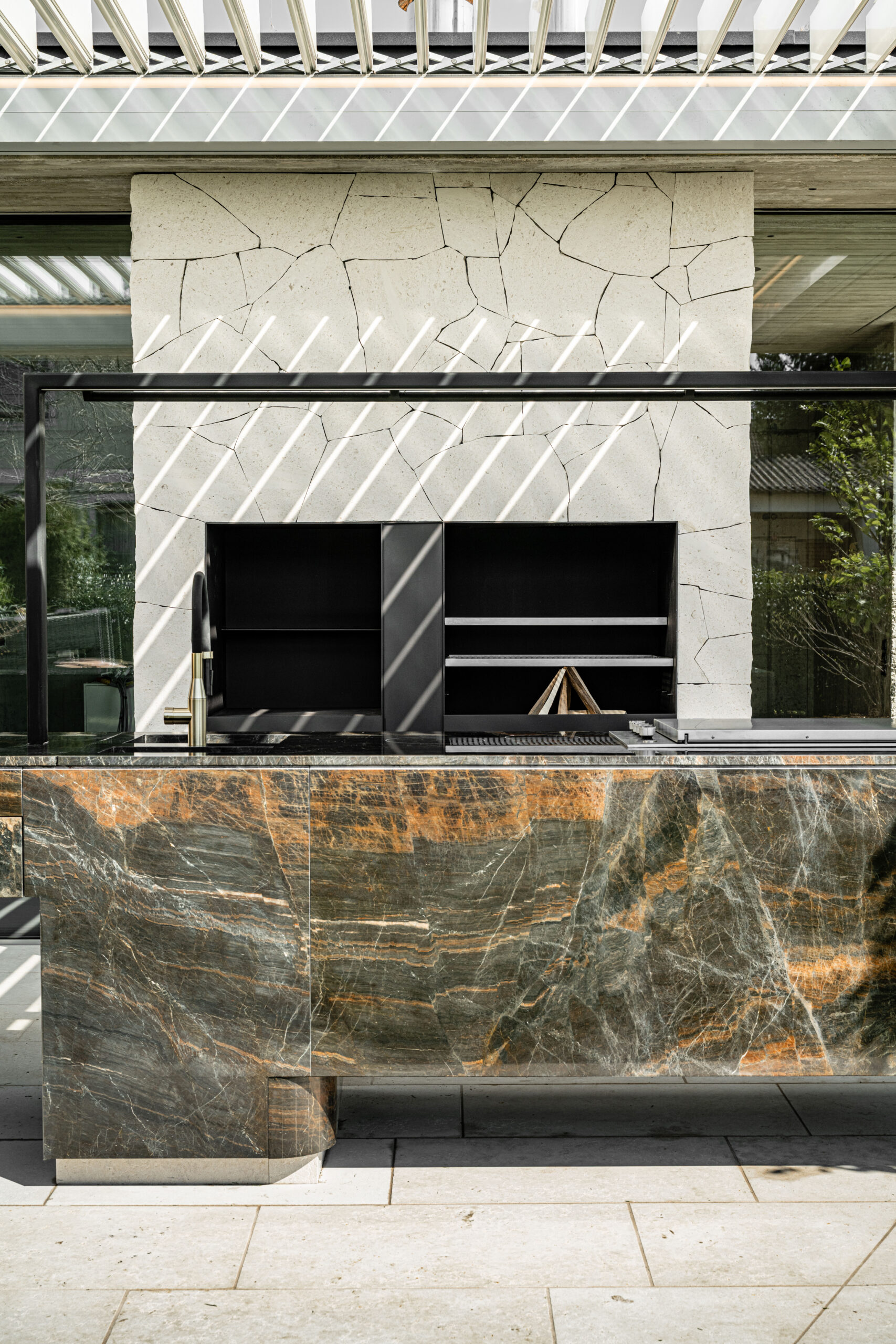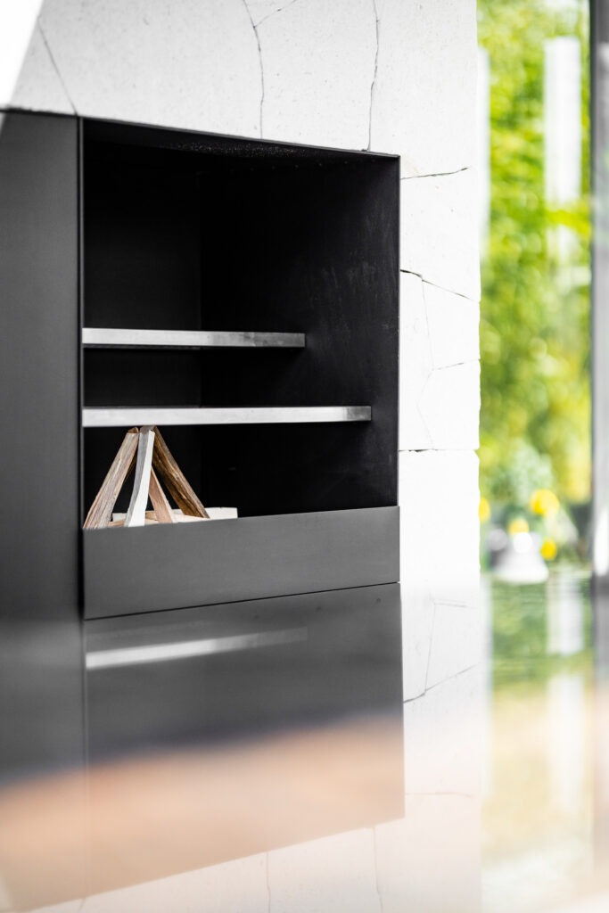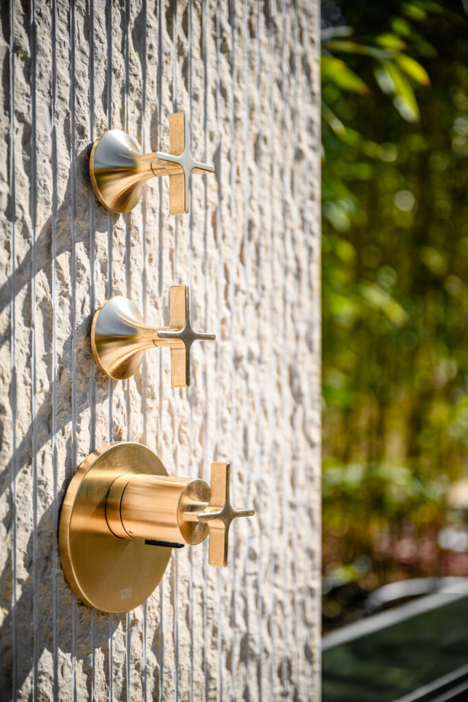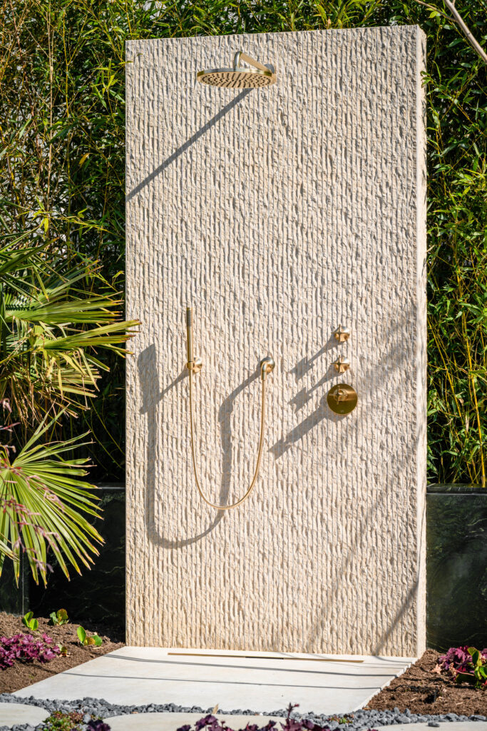 Ergänzt wurde diese ästhetische Outdoor-Inselwelt um weitere Monolith Key Pieces: wie einen kleinen, feinen Whirlpool, eine moderne Außendusche, passende Sitzbänke, Wandverkleidungen und Kamin sowie eine wärmende Feuerstelle. Um auch an kühlen Sommerabenden das mediterrane Lebensgefühl bis spät in die Nacht genießen zu können. Bei der Verlegung der Natursteinarbeiten zur Outdoor-Dusche kam ebenso der hochwertige Kalkstein Kanfanar zum Einsatz, wobei seine charakteristische Rigatto-Oberfläche, geprägt durch feine, linienförmige Einfräsungen, dem Material eine elegante und zugleich natürliche Wirkung verleiht. Besonderes Augenmerk galt den handbearbeiteten Kanten, welche an den Ecken einen fließenden, optisch durchgehenden Verlauf erzeugen. Mit präzisem Maschinenschnitt und traditioneller Handarbeit wurde der Stein somit perfekt in Szene gesetzt.