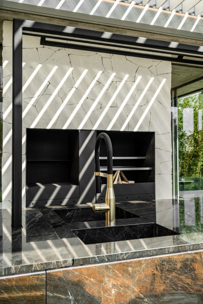 Outdoor-Küchen: eine Küche aus widerstandsfähigem, robusten Kanfanar in Kombination mit edlen Materialien wie Edelstahl punktet durch hochwertige Qualität respektive einzigartiges Design und hebt luxuriöses Outdoor Living auf ein neues Niveau.