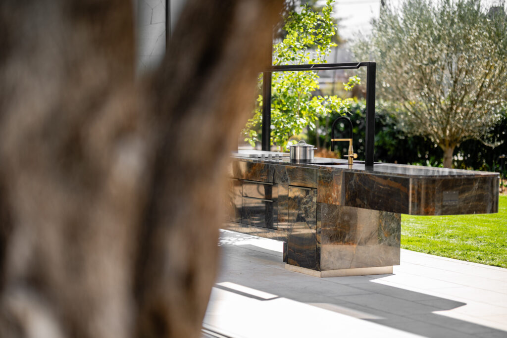 Zum gewünschten mediterranen Lebensgefühl gehört unausweichlich auch der kulinarische Genuss im Garten dazu. Mit der neuen Generation an kreativen Küchendesigns lässt sich der Außenbereich in eine funktionale wie ästhetische Kochlandschaft verwandeln. Denn dank innovativer Induktionsfelder, großzügiger, nach Maß gefertigter, robuster Arbeitsplatte sowie viel Stauraum für Küchenutensilien, Geschirr, Gläser und Besteck werden Garten und Terrasse zu einem Ort des Genusses auf höchstem Niveau. Obligatorische Küchengeräte wie (Wein)Kühlschrank, Griller oder Geschirrspüler runden das Kocherlebnis unter freiem Himmel ab.
